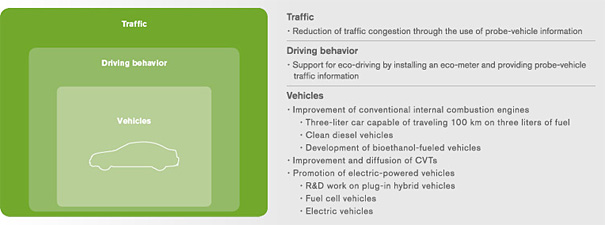 為了大幅度減少二氧化碳排放量,不僅僅汽車,人與交通環(huán)境的綜合削減努力也十分重要。 除了提高發(fā)動(dòng)機(jī)及變速箱的油耗性能及推動(dòng)電動(dòng)化的發(fā)展,還要大力應(yīng)用幫助客戶進(jìn)行節(jié)能駕駛的ECO儀表及發(fā)展利用實(shí)時(shí)信息、減輕交通堵塞方面有代表性的ITS (Intelligent Transport System:智能道路運(yùn)輸系統(tǒng))技術(shù),從多方面對(duì)環(huán)保事業(yè)做出貢獻(xiàn)。