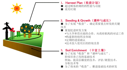 我們為了實現這個美好的愿景,積極在“果園概念”框架內推動研發技術。技術開發的概念范圍很廣,難以用一句話進行概括,如何把握其中的內涵推動事業的戰略化及規劃化變得十分重要。例如從即將投放市場的技術到扎實的基礎研究涵括了各種各樣的技術,致力于綜合概括這些技術的整體構圖形成了“果園概念”。