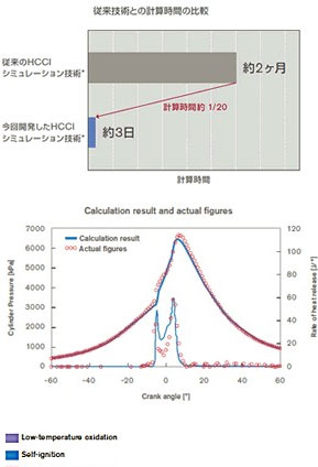 HCCI燃燒實際上相當(dāng)于用數(shù)千種化學(xué)反應(yīng)式表達出來的復(fù)雜化學(xué)反應(yīng)過程。如果通過模擬試驗忠實地將這些反應(yīng)過程重現(xiàn),以現(xiàn)有計算機的演算能力,一次的燃燒計算需花費約2個月的時間,在實際的發(fā)動機研發(fā)中使用非常不現(xiàn)實。這次研發(fā)出的模擬實驗技術(shù)通過運用日產(chǎn)長期積累的燃燒相關(guān)基礎(chǔ)數(shù)據(jù)及依據(jù)經(jīng)驗所得的高度燃燒建模技術(shù),將此前的HCCI模擬實驗效率提高了約20倍。計算時間縮短至約3日,因此已經(jīng)可以應(yīng)用在發(fā)動機研發(fā)上。