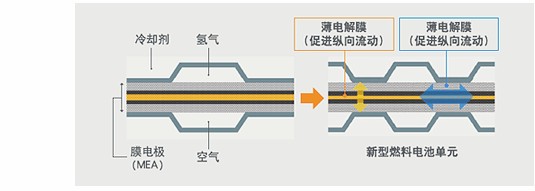 改良膜電極(MEA)材質(zhì)和隔板的氣體流通性,促進(jìn)發(fā)電必需物質(zhì)(氫氣、空氣)以及發(fā)電過程中產(chǎn)生物質(zhì)(水、電子)的移動(dòng),從而提高了燃料電池組的輸出效率。