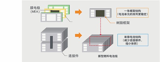 膜電極(MEA)的一體式框架可以使燃料電池單元整齊穩(wěn)定地排成一列。從而縮小了燃料電池組的體積。