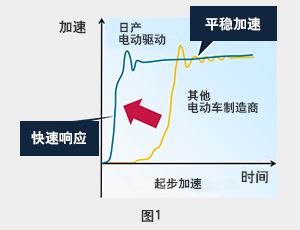 使用獨立的前后電機,動力總成系統可產生高功率和大扭矩輸出。這一輸出輔以日產先進的電動車技術提供的1/100-1/10,000*秒超高精度電機控制,可實現快速響應且超乎尋常的平穩加速。(圖1)